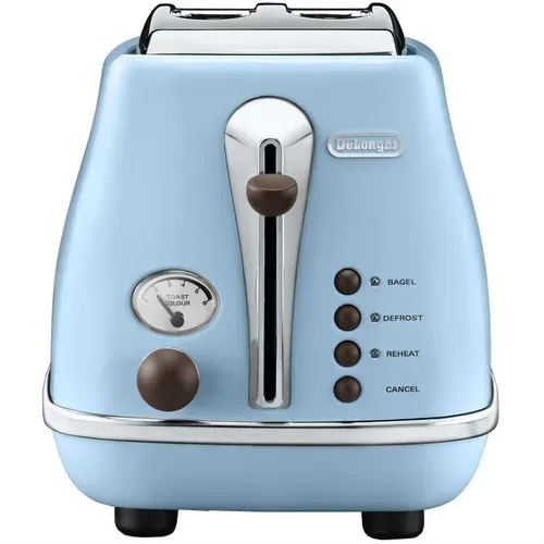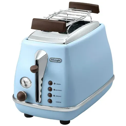 Тостер DeLonghi CTOV2103.AZ — стильная модель из коллекции Icona Vintage, выполненная в нежном бирюзовом цвете с винтажными элементами оформления. Благодаря двум широким слотам прибор подходит для поджаривания тостового и более плотного хлеба.